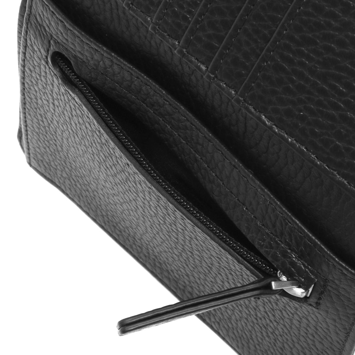 エンポリオアルマーニの二つ折り財布です。上品なブラックレザーの高級感あるボディ。フラップ部分の、さりげないブランドロゴが特徴的なデザイン。