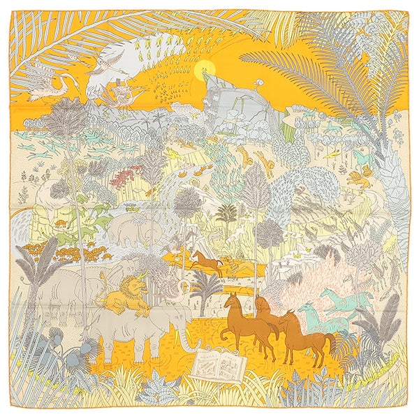 エルメス HERMES スカーフ カレ90 シルク ブトンドール×マルチカラー 【LE CARNAVAL DES ANIMAUX/動物の謝肉祭】 ソルド品 【中古】