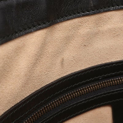 【外側】表面に押し跡やシワ、擦れ、コバに剥げやヒビ、押し跡や薄汚れ、ショルダーに小傷や押し跡、薄汚れ、金具に小傷や塗装剥がれ【内側】薄汚れや毛羽立ち【におい】タバコのにおい移り