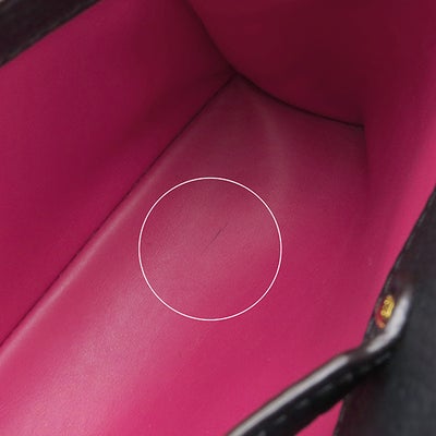 【外側】四つ角にスレ、底鋲にメッキがれと割れ、コバにヒビと強い押し跡、ストラップ金具にメッキがれと汚れ【内側】僅かなペン汚れ、ラメ汚れ、押し跡【におい】僅かな保管臭