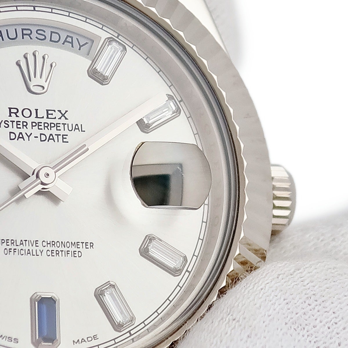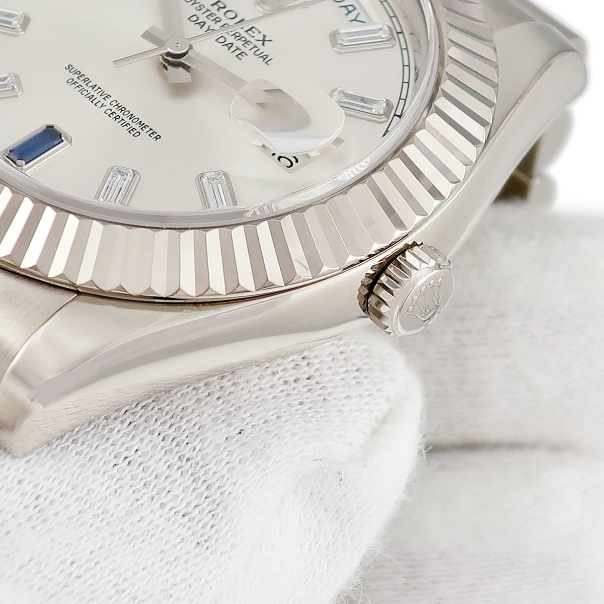 他の画像を見る ロレックス ROLEX デイデイト II 218239BG K18WG無垢 純正ダイヤ&サファイア バゲット ランダム番 メンズ 腕時計自動巻き シルバー 【中古】 ROLEX腕時計 当店価格: ¥ 7,869,400 税込 中古 カートに入れる