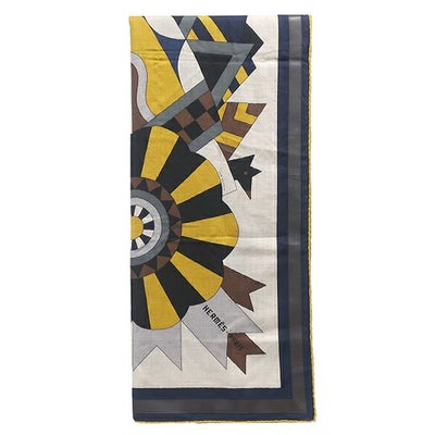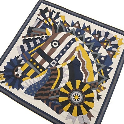 エルメス HERMES ストール ショール カレ140 CARRE カレジェアン カシミヤ シルク ナチュラル×マリン×マスタード 【Cheval de Fete /シュヴァル ドゥ フェット】 タグ欠品 【中古】