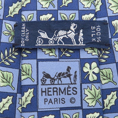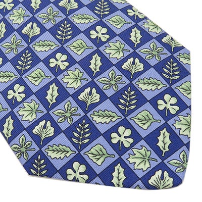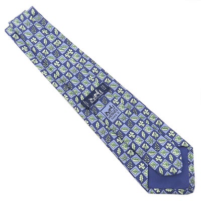 エルメス HERMES ネクタイ 総柄 9cm シルク ネイビー×ブルー 市松模様 葉っぱ リーフ柄 【中古】