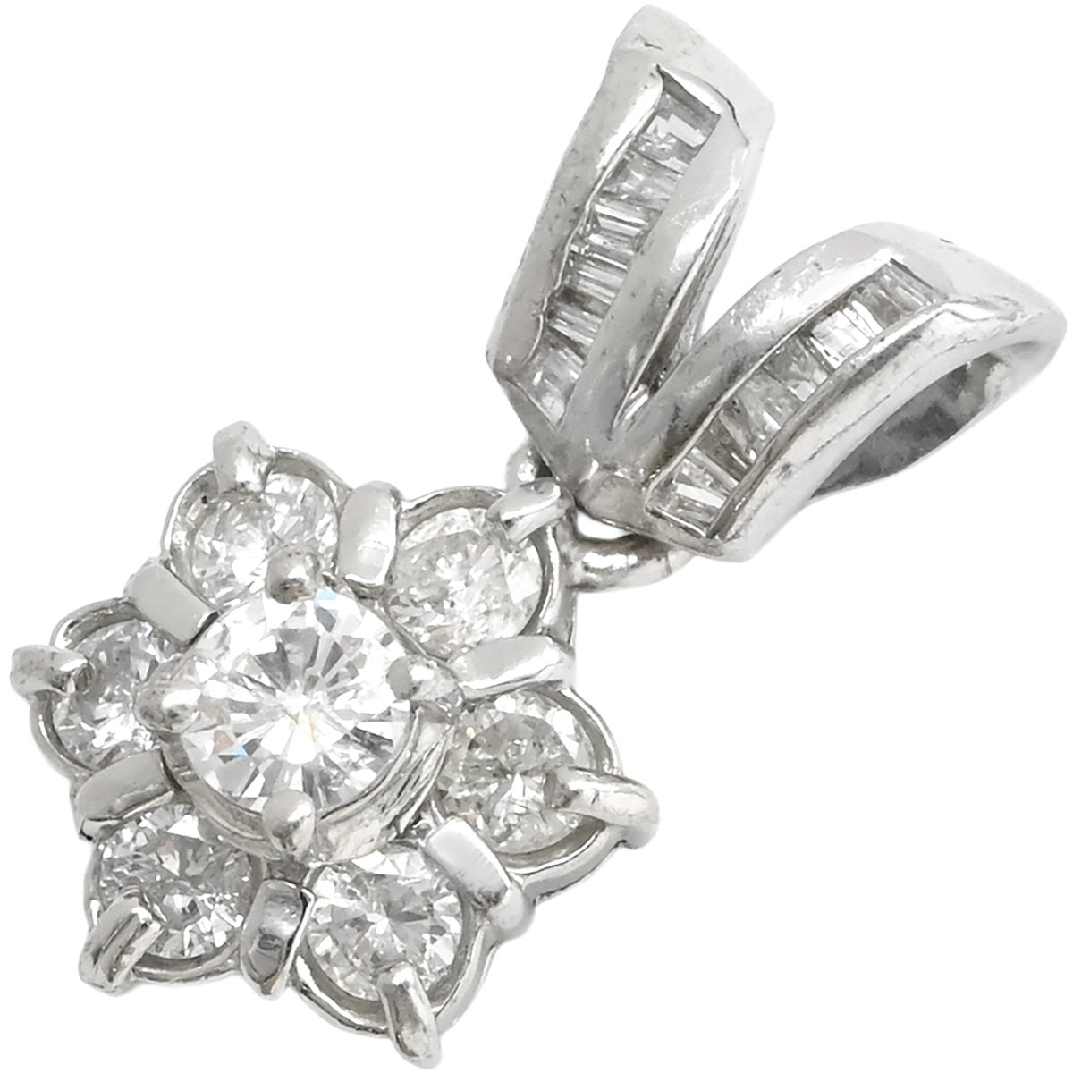 他の画像を見る ペンダントトップ プラチナム ダイヤ プラチナシルバー Pt900 花モチーフ V字金具 ラウンドブリリアントカット テーパーバゲットカット 【中古】 NON BRANDペンダントトップ 当店価格: ¥ 73,500 税込 中古 カートに入れる