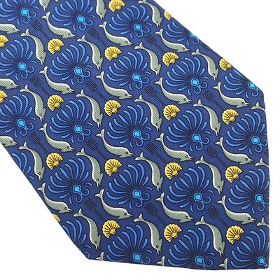 エルメス HERMES ネクタイ イルカ柄 9cm シルク ブルー×マルチカラー 青 紺 いるか 貝 【中古】