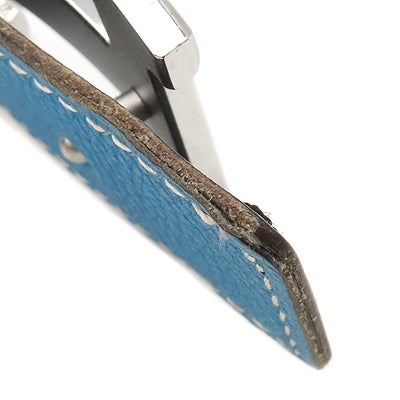 表面にヨレ、黒レザーに擦れ傷、青レザ―に金具汚れ、コバに割れや接着の剥がれ、穴に広がりや僅かなヒビ、金具に小傷やくすみ、変色【刻印の場所】青レザー剣先