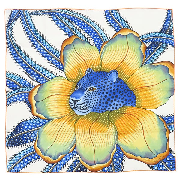 エルメス HERMES スカーフ カレ90 CARRE シルク オレンジ×ブルー×マルチカラー 【Baobab Cat/バオバブ・キャット】 【箱】 【中古】
