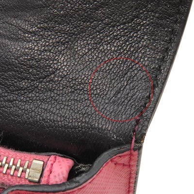 【外側】底部に変色、糸切れ、薄汚れ、金具に小傷、ショルダーの穴部分にヒビ【内側】薄汚れ、シワ、スレ、開口部根元のコバにヒビ、ファスナー部分に毛羽立ち【におい】保管臭