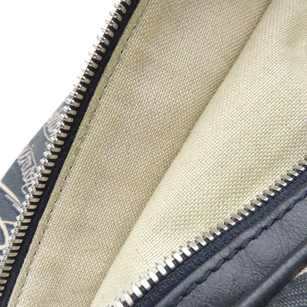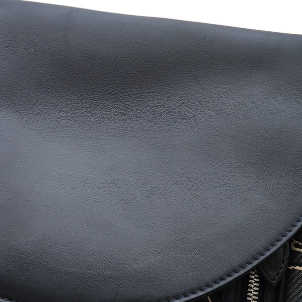 【外側】表面に擦れやボンド染み、レザーに擦れや擦れ傷、僅かな薄汚れ、四つ角やフチに擦れや剥げ、コバにヒビ、ショルダーに毛羽立ち【内側】外ポケット含む内側生地に擦れや薄汚れ、僅かな青い汚れ、ポケットに黒い汚れやシミ、フラップ裏に擦れ傷【におい】強い保管臭