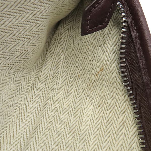 【外側】四つ角にスレ、表面にシワ、金具にくすみ、縁に捲れ、コバにヒビ【内側】ボンド染み【におい】保管臭【刻印の場所】内側ファスナー取っ手 ※保存袋に汚れ、箱に破損有