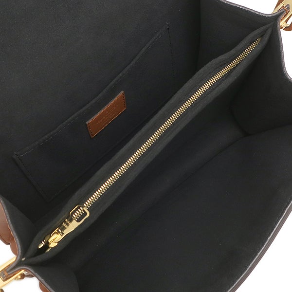 【外側】若干の反り、茶レザーに僅かな擦れ傷や薄汚れ、僅かな糸の毛羽立ち、コバに僅かなヒビ、金具に擦れや小傷、ストラップにシワ【内側】レザーに擦れや剥げ、内側生地に擦れや薄汚れ、押し跡、コバにヒビ割れ、金具にくすみ【におい】保管臭