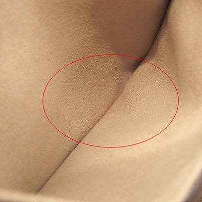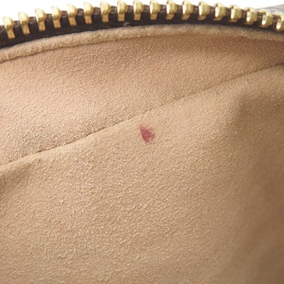 【外側】四つ角やフチに擦れ、茶レザーに擦れや押し跡、表面レザーに僅かな押し跡や汚れの付着、ストラップにクセ、金具に小傷や塗装剥げ【内側】擦れや薄汚れ、赤い汚れ、ポケット内側に僅かな色移りやラメの付着【におい】保管臭