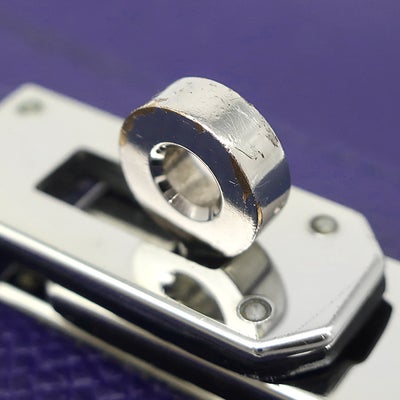 【外側】型崩れ、表面に擦れや擦れ傷、角周りに擦れや剥げ、コバに擦れ、ベルトに伸び、金具に擦れや小傷、塗装剥がれ【内側】擦れや押し跡、小銭汚れやラメの付着、コバに割れ【におい】保管臭【刻印場所】オープンポケット内側