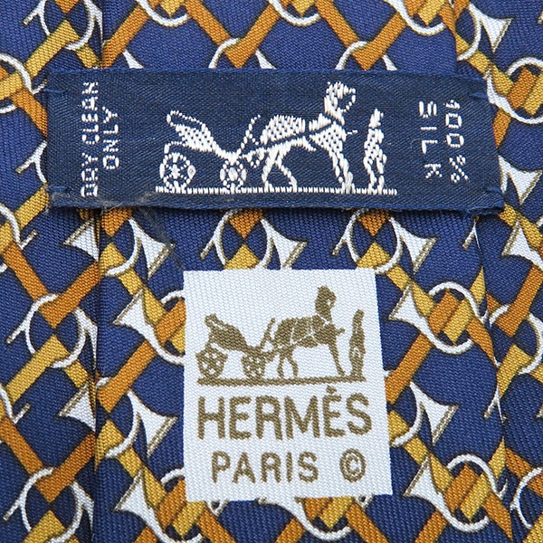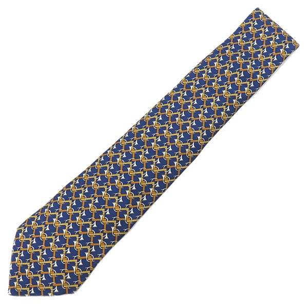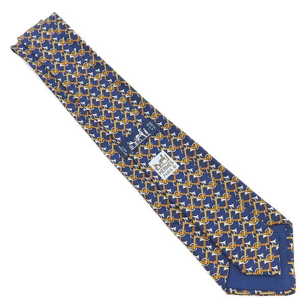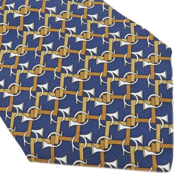 エルメス HERMES ネクタイ 総柄 9cm シルク ネイビー×ブラウン トランペット 楽器柄 【中古】