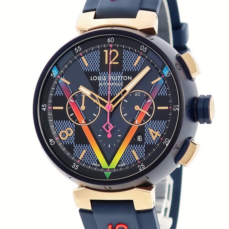 ルイヴィトン LOUIS VUITTON タンブール クロノグラフ ダミエ コバルト Vレインボー QA129 K18PG×SS 渋谷限定 メンズ 腕時計自動巻き マルチカラー 【中古】