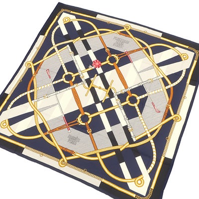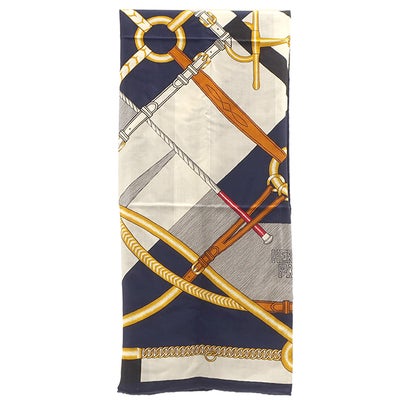 エルメス HERMES ストール ショール カレ140 CARRE カレジェアン カシミヤ シルク マリン×ホワイト×ゴールド 【PARCOURS SANS FAUTE/完璧なコース】 【箱】 【中古】