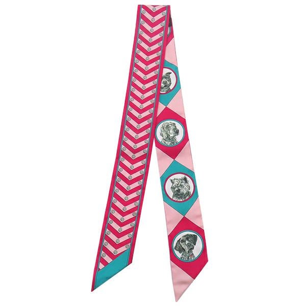 エルメス HERMES スカーフ ツイリー シルク フランボワーズ×ヴェール×ローズ 【Colliers et Chiens Plumetis/首輪と犬】 【箱】 【中古】