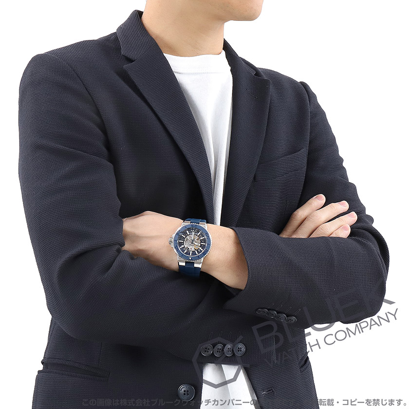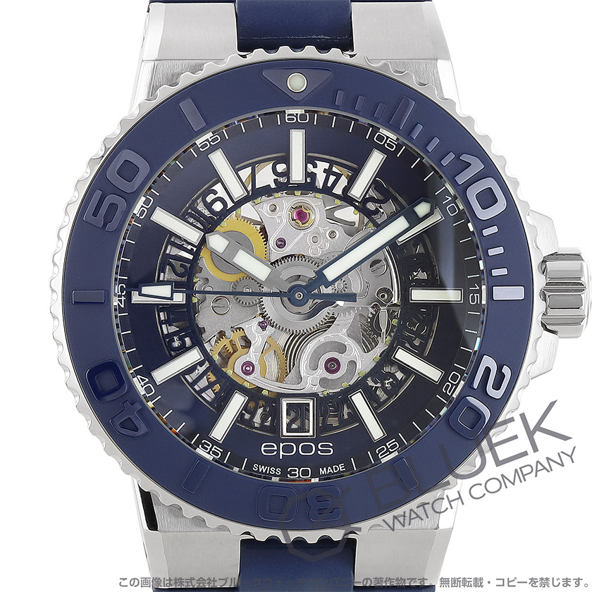 厚さ14ミリの43ミリ500m防水ケースに丸みを帯びた風防や浮き彫りが施されたダイビングスケール付きブルーベゼル、自動エスケープバルブを備えたスポーティブスケルトンは、ダイヤルから機械の内部構造を覗くエポス人気のダイバーズモデル。無駄を削ぎ落とした自動巻きムーブメントを搭載して6時の窓にデイトディスクから続く日付を表示します。中でもブラック外周にも段差をつけた立体構造ダイヤルにブルーサークルとホワイト立体インデックス引き立つこのモデルは、二重ロック式バックルを備えたブルーラバーベルトも魅力。スポーティなデザインが幅広い装いにマッチして手元を若々しく彩り、ケースバックからも機械の意匠が鑑賞できてメカ好きの目を楽しませます。
