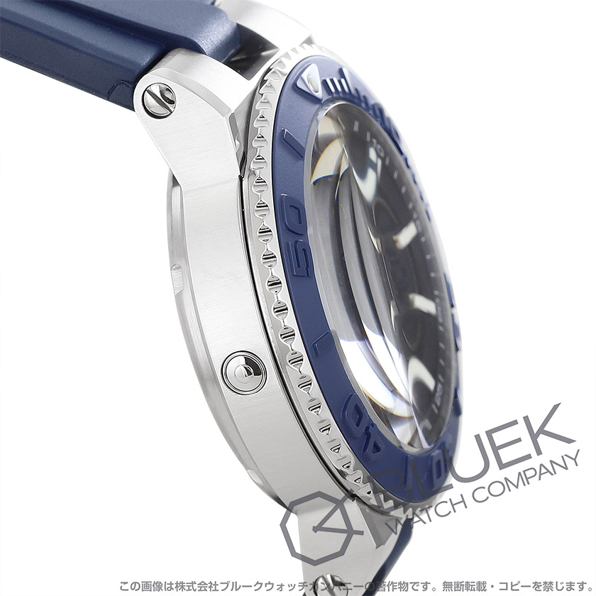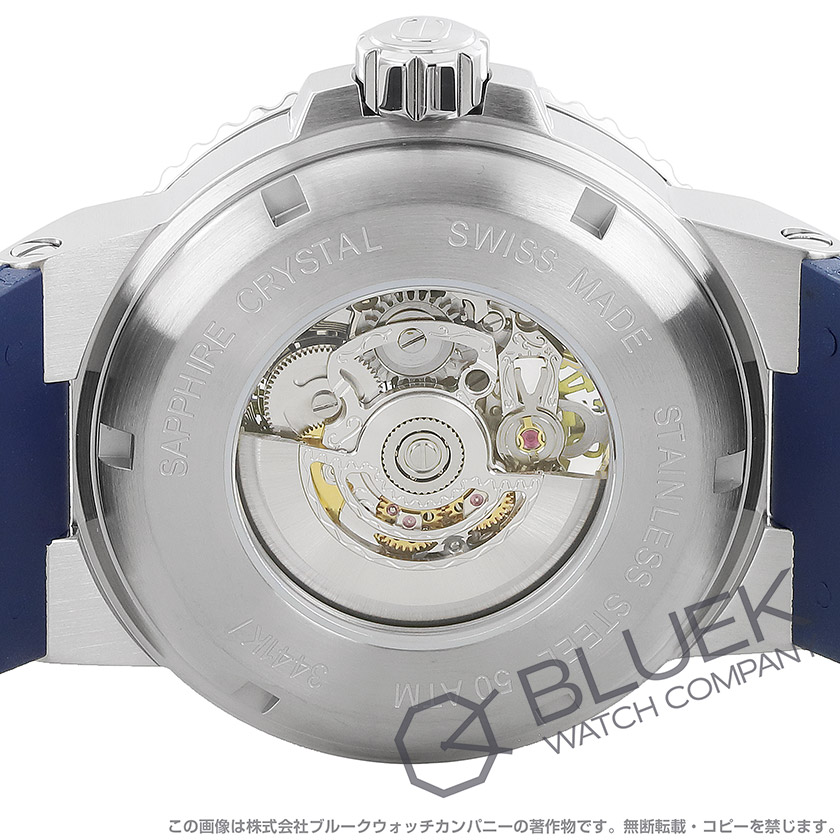 艶なし(一部艶あり)のシルバーステンレスケース・艶なし(一部艶あり)のブルーステンレスベゼル・シルバー&ブルー文字盤・蛍光塗料を施したシルバーの指針・バーインデックス・6時位置にブランドロゴと日付表示・ブルーのラバーベルト・二重ロック式の片開きバックル・ねじ込み式リューズ・リューズガード・逆回転防止ベゼル・スクリューバック・バックスケルトン・バックル部分、裏蓋にブランドロゴ・裏蓋にシリアルナンバー