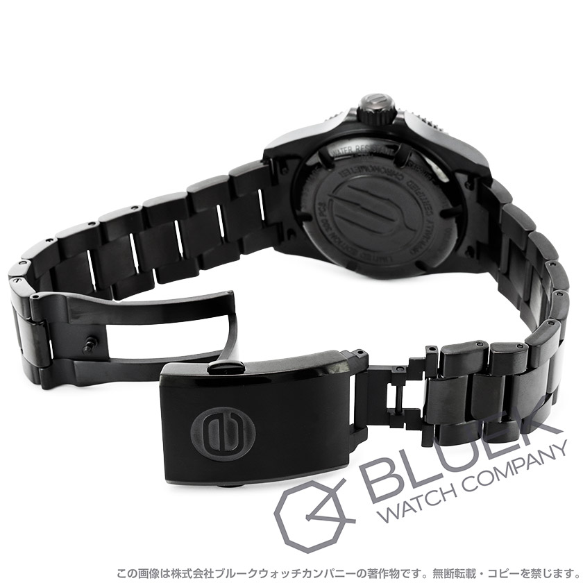 艶あり(一部艶なし)のブラックチタンケース・艶ありのブラックセラミックベゼル・ブラック文字盤・蛍光塗料を施したシルバーの指針・アラビアインデックス・艶あり艶なしブラックチタンの3連ブレス・プッシュ式の片開きバックル・ねじ込み式リューズ・逆回転防止ベゼル・スクリューバック・裏蓋に限定ナンバー