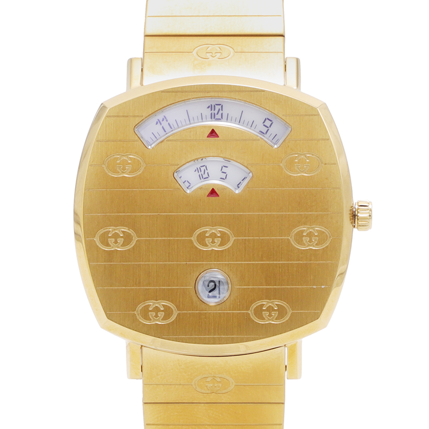 1970年代後半のスケートボーダーにインスピレーションを得たクッション形フラットな厚さ6ミリの35ミリゴールドケースに時間・分・日付を表示する3つの窓を設けたグリップクオーツは、通常の時計とは一線を画すデザインも斬新なグッチ人気のジェンダーレスモデル。ボードに足元を密着させるグリップテープに由来し、小ぶりな薄型ボディがフィット感にも優れます。中でもツヤを消したケース上面&ブレスにケース側面の光沢が手元でキラリと光を反射させるこのモデルは、両開きバックルも魅力。ケースとブレスにはグッチのアイコン“インターロッキングG”とボーダーが施されて手元をスタイリッシュに彩ります。
