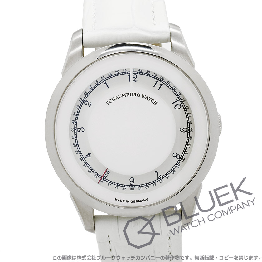 艶なし(一部艶あり)のシルバーステンレスケース・艶ありのシルバーステンレスベゼル・ホワイト文字盤・レッドの指針・アラビアインデックス・ホワイトの革ベルト・Dバックル・腕周り調整は約9.5mm幅の間隔で6段階可能・バックスケルトン・裏蓋にシリアルナンバー