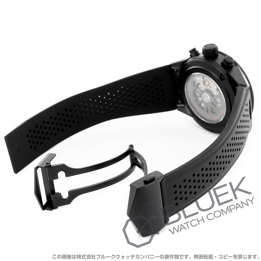 艶なしのブラックセラミックケース・艶なしのブラックセラミックベゼル・ブラック文字盤・蛍光塗料を施したシルバーの指針・バーインデックス・12時位置に30分計・3時位置にブランドロゴ・3時から4時位置に日付表示・6時位置に12時間計・9時位置にスモールセコンド・ベゼルにタキメーター・ブラックのラバーベルト・Dバックル・バックスケルトン・バックル部分、振り子にブランドロゴ・裏蓋にシリアルナンバー