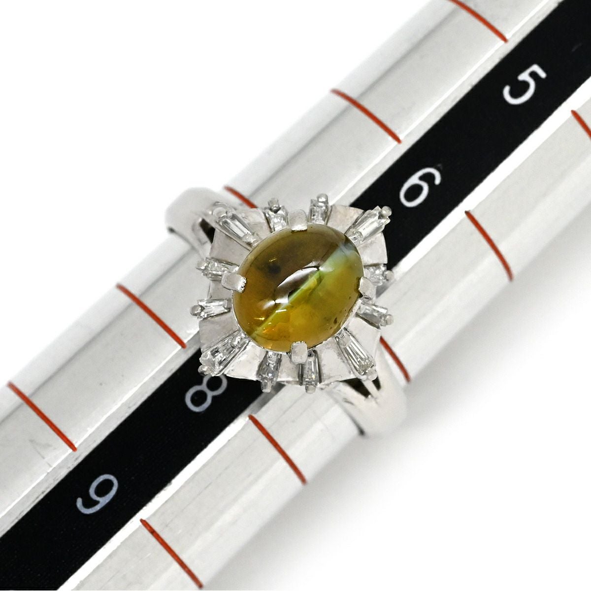 他の画像を見る リング 指輪 キャッツアイ2.1ct ダイヤリング プラチナシルバー 猫目石 緑褐色 PM900 テーパーダイヤ 7号 【中古】 当店価格: ¥ 91,140 税込 中古 カートに入れる