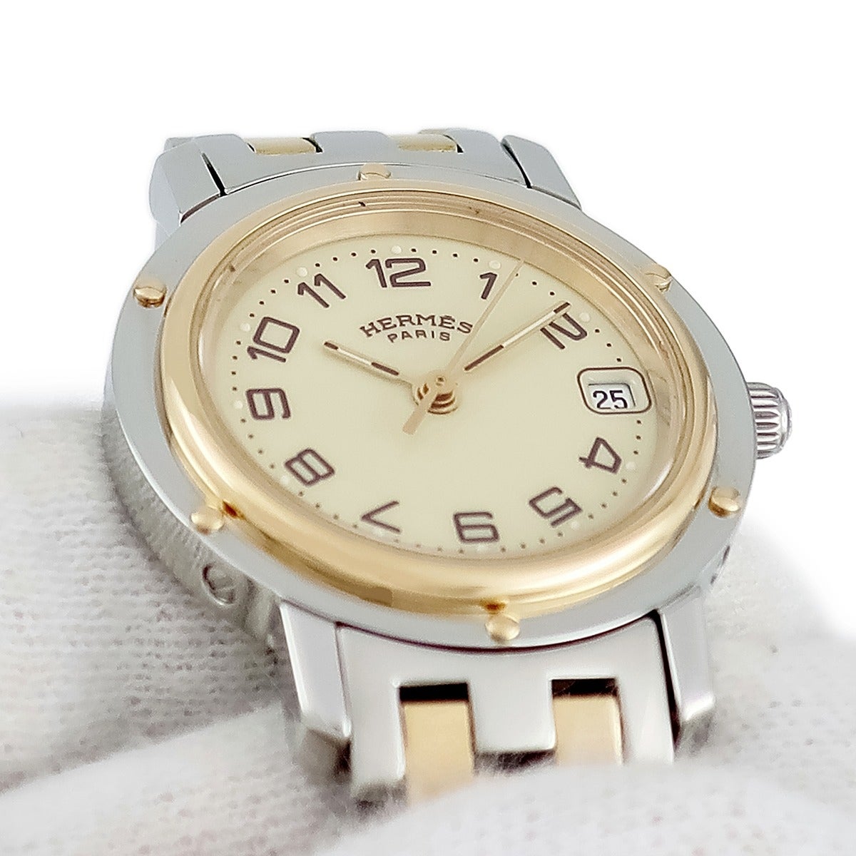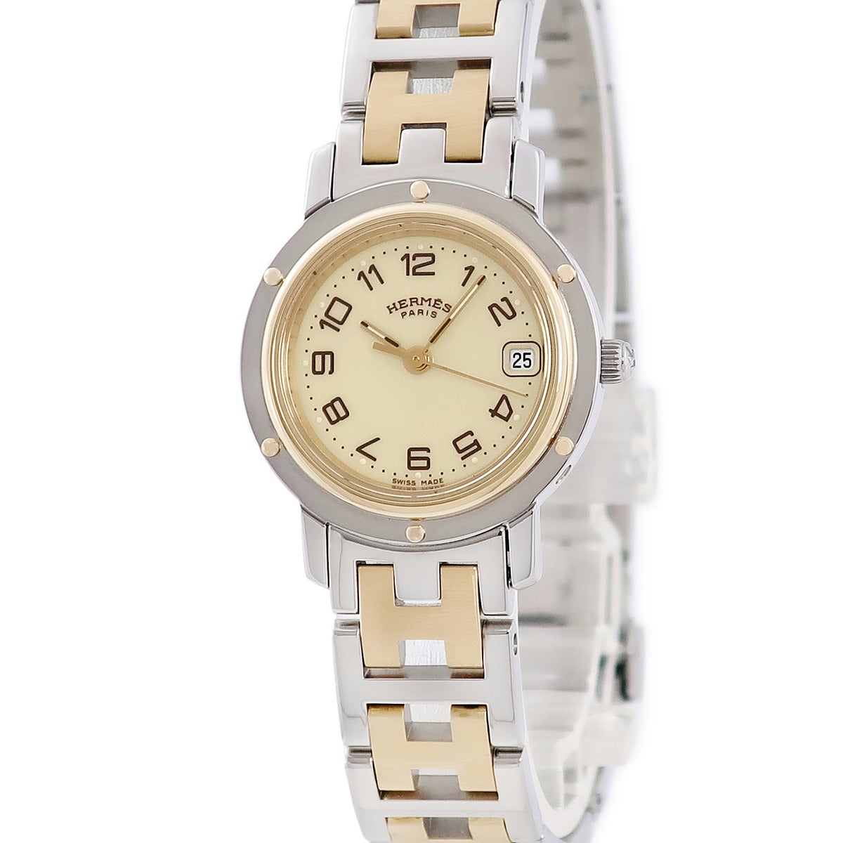 他の画像を見る エルメス HERMES クリッパー CL4.220 GP×SS コンビ アイボリー デイト Hマークブレス レディース 腕時計クオーツ ベージュ 【中古】 当店価格: ¥ 116,424 税込 中古 カートに入れる