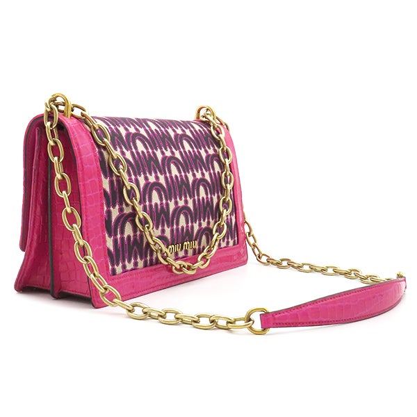 他の画像を見る ミュウミュウ MIU MIU ショルダーバッグ チェーンショルダー キャンバス レザー ピンク ゴールド金具 エムエムパリス ロゴ 総柄 クロコ型押し ビジュー 【中古】 当店価格: ¥ 111,720 税込 中古 カートに入れる